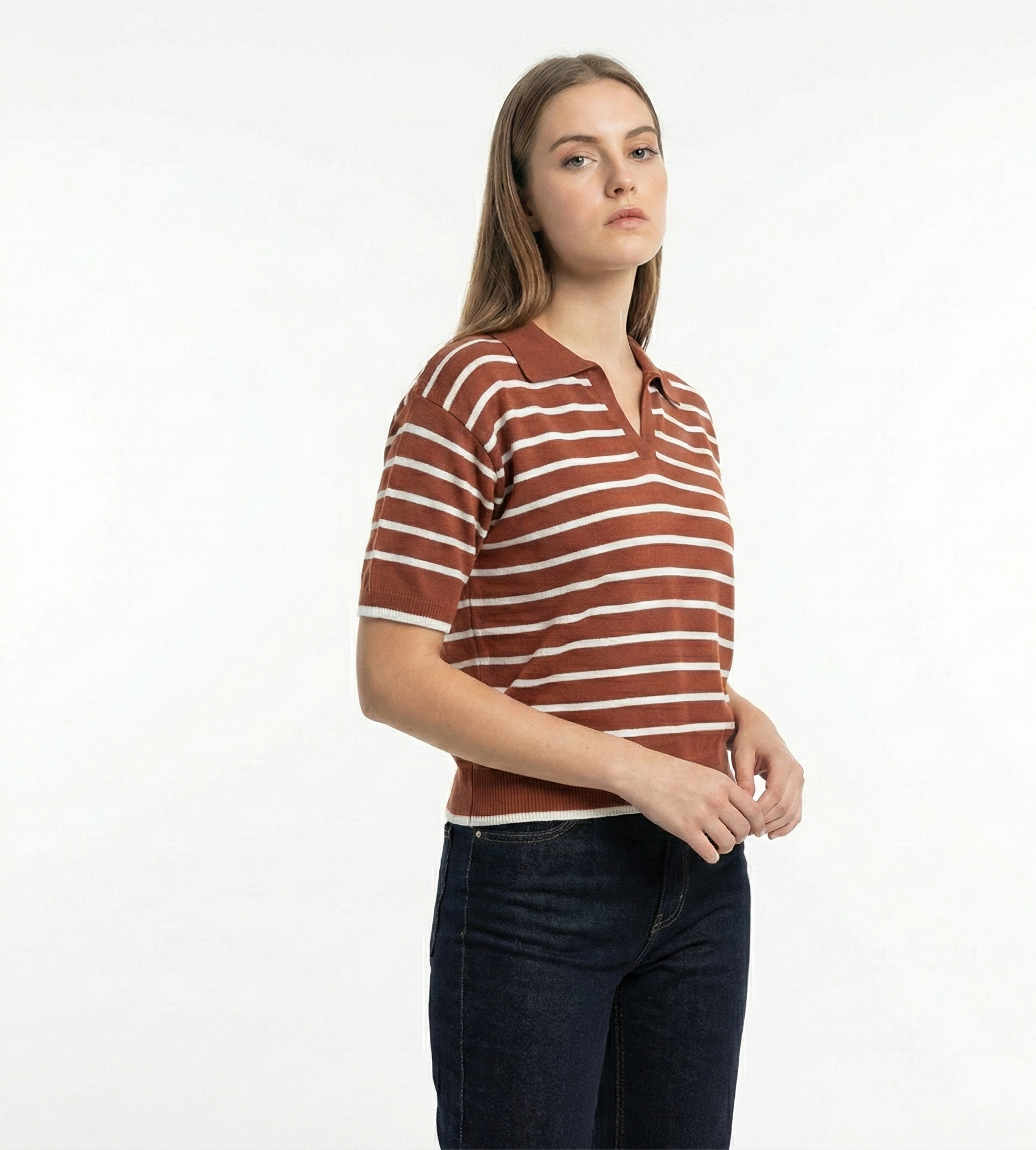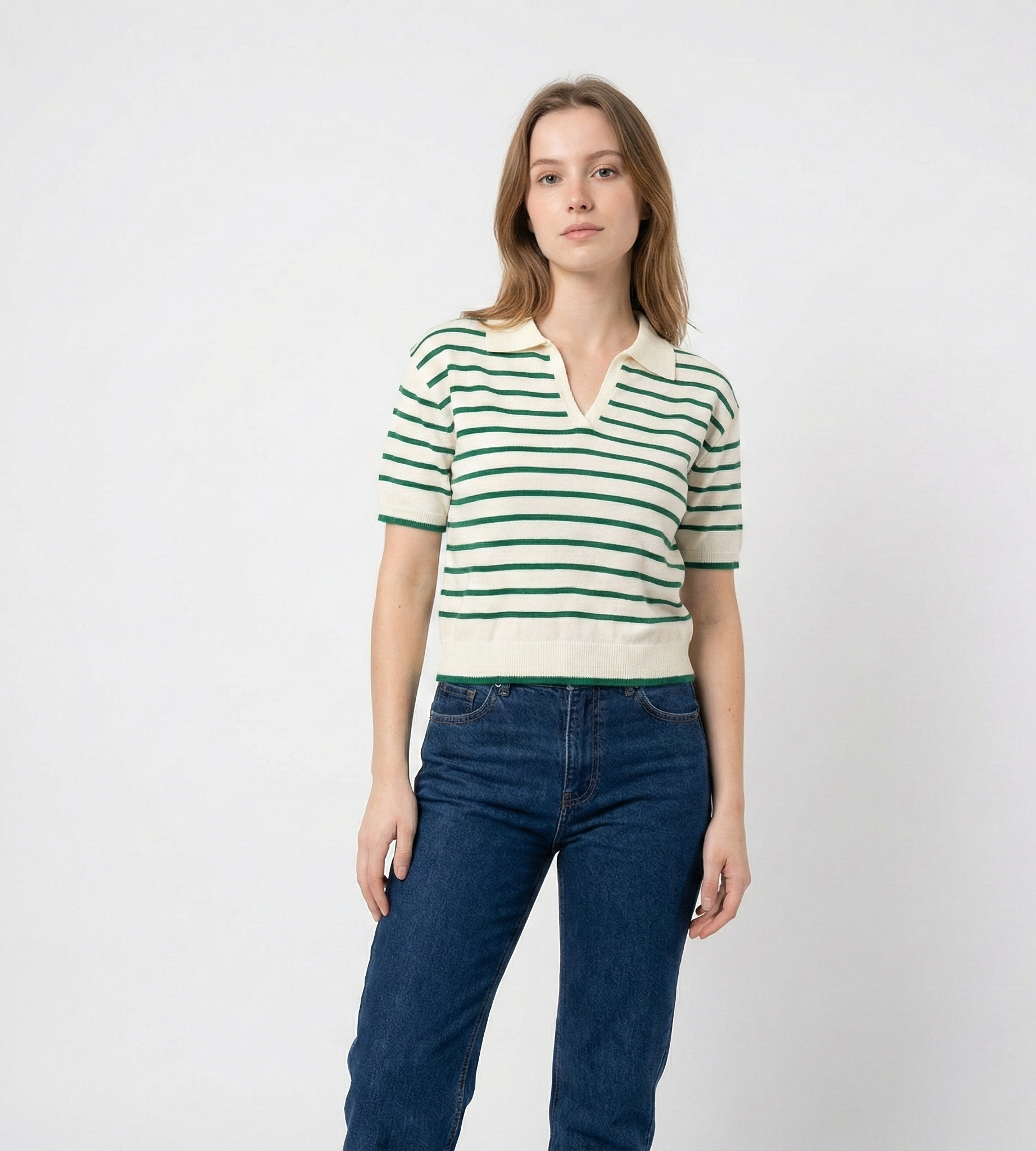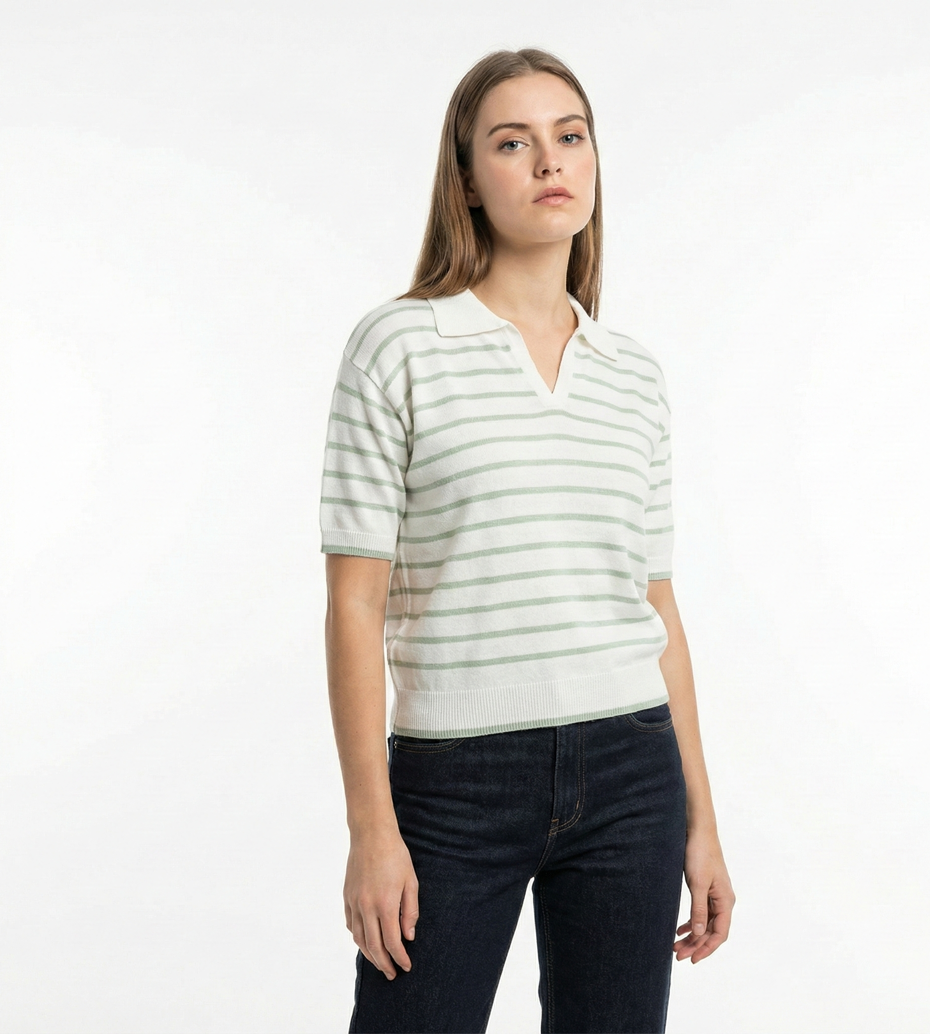 Tejido: Punto liso (Jersey) con cuello tipo polo y escote en V sin botones.