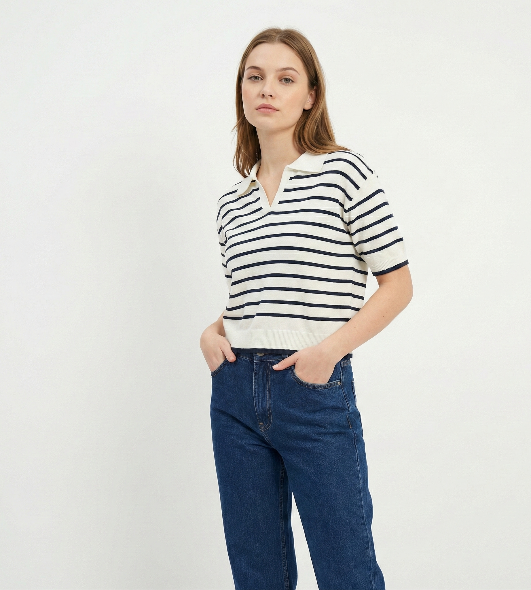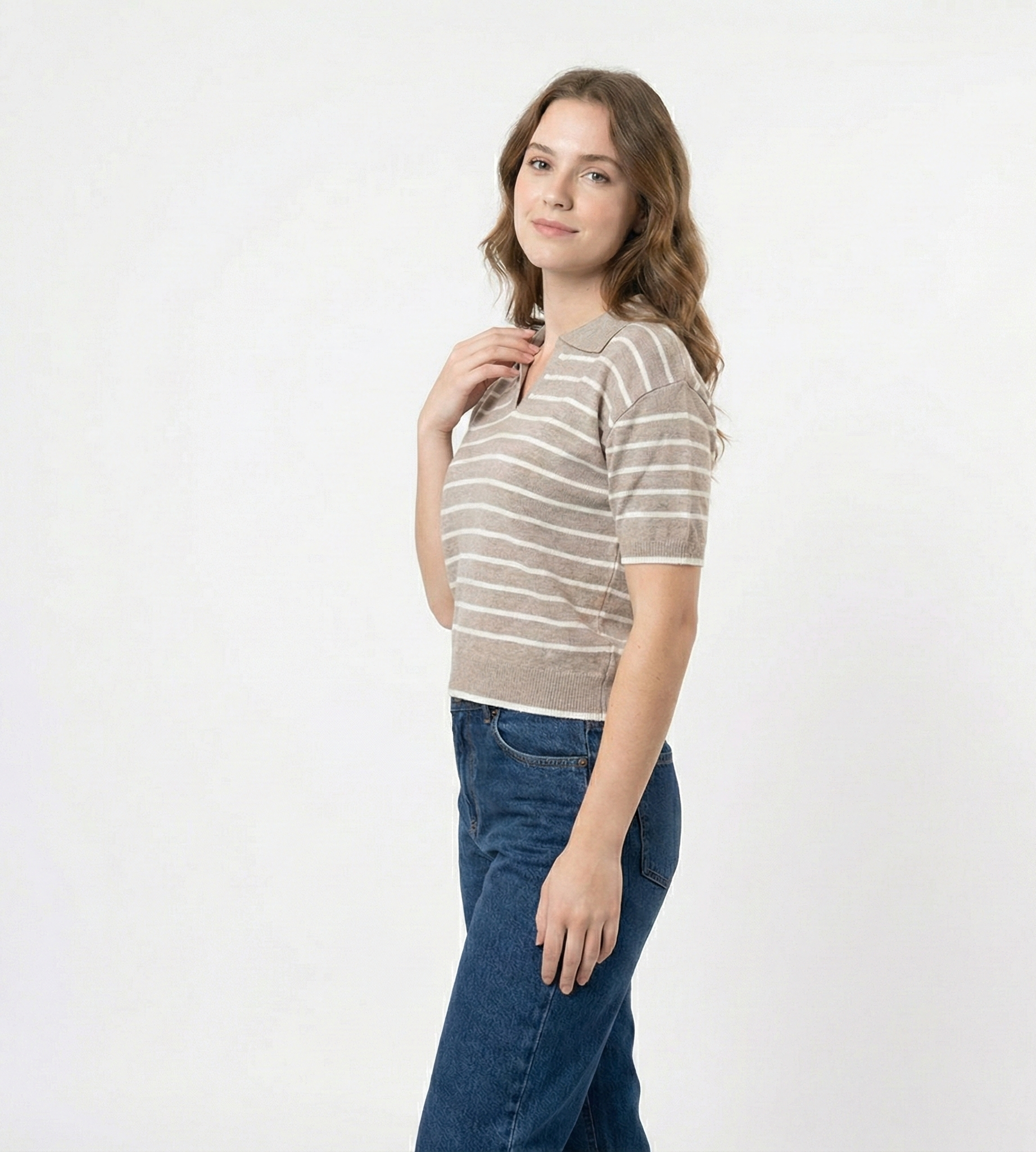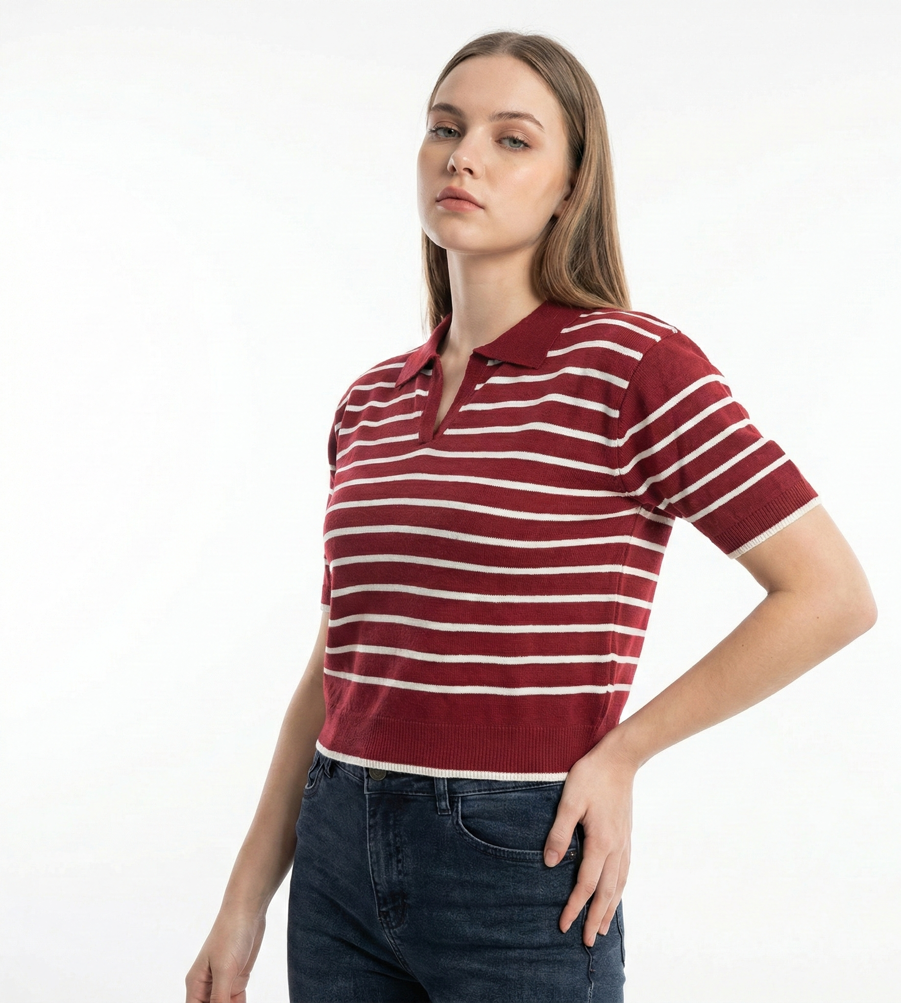 Tejido: Punto liso (Jersey) con cuello tipo polo y escote en V sin botones.