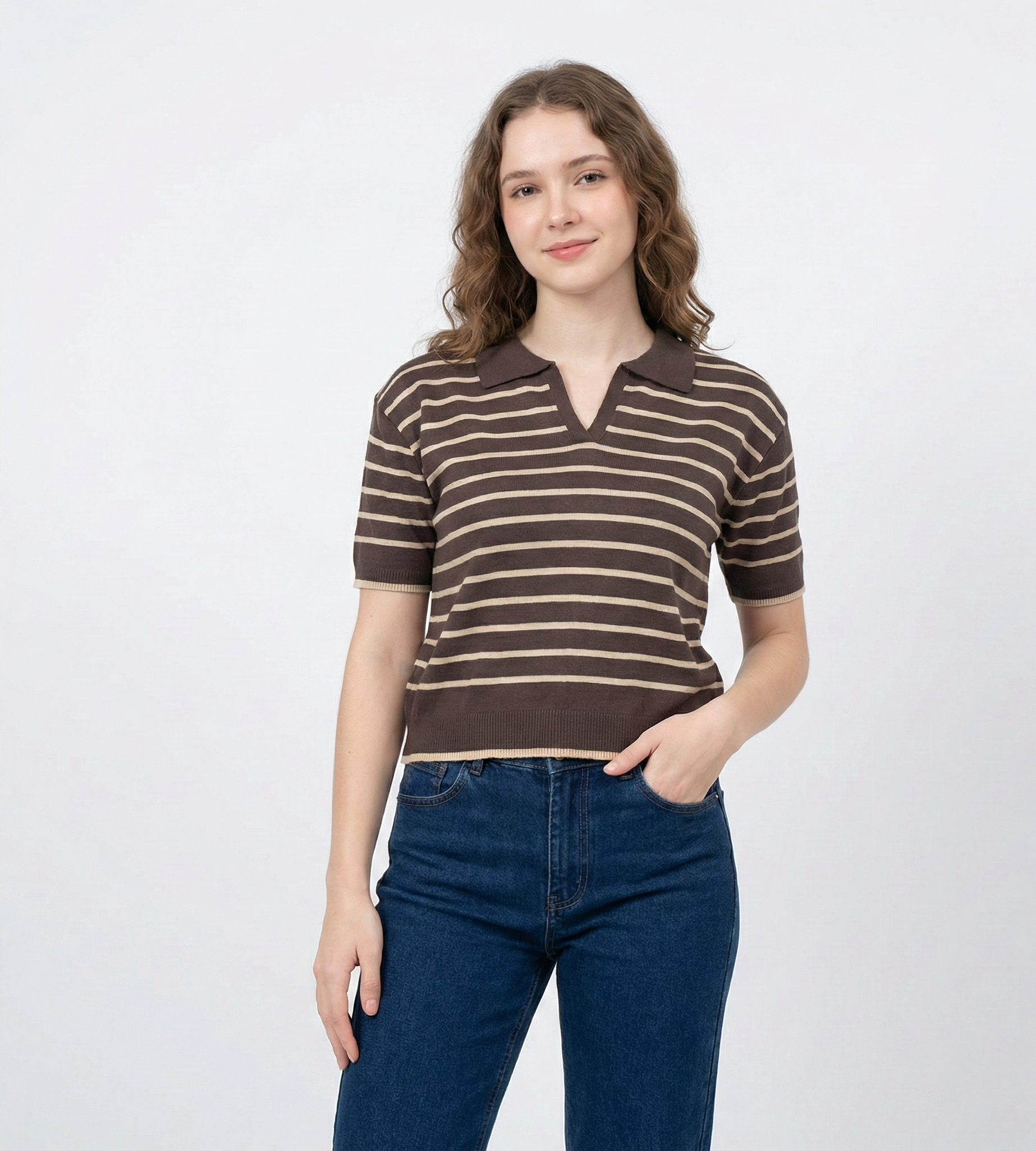 Artículo: Chomba tejida de manga corta con diseño de rayas horizontales finas.